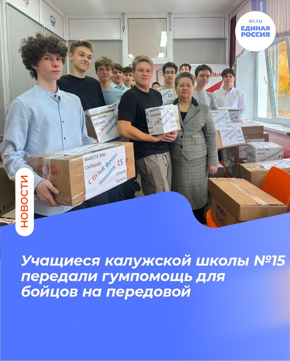 ✊Учащиеся калужской школы №15 передали гумпомощь для бойцов на передовой - об этом рассказала председатель комитета по социальной политике Законодательного Собрания, член фракции "Единая Россия", директор школы №15 Калуги Татьяна Дроздова. - Ученики, родители и учителя объединились ради общей цели - поддержать наших военнослужащих. Собранная гуманитарная помощь передана в Калужскую региональную волонтëрскую организацию «Калужский рубеж». Помощь отправится на Курское направление. Также мы отправили гуманитарную помощь для 4-го Калужского батальона. Вместе мы сильнее! – написала на странице в своей социальной сети Татьяна Дроздова. #ЕР40 #ЕдинаяРоссия