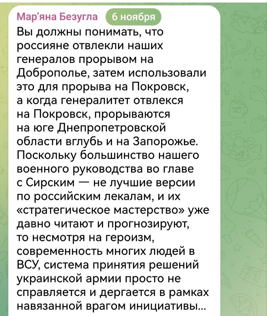 🪂 Русский Генштаб переиграл командование ВСУ У хохлов истерика, ищут крайнего за провалы и обрушения на фронтах. Хохлы признают, что российский Генштаб переиграл их и в тактике и в стратегии! "ВС РФ отвлекли украинских генералов прорывом на Доброполье, затем использовали это для прорыва на Покровск, а когда генералитет отвлекся на Покровск, прорываются на юге Днепропетровской области вглубь и на Запорожье", — нардепутат Верховной Рады Безуглая. "Люська" Арестович, тоже чё-то знает и предрекает скорую катастрофу для ВСУ. Русская Армия давит и наступает на всём направлении фронта! ВС РФ имеют стратегическую инициативу! Наши воины освобождают исторические земли России, Донбасс и Малороссию, уничтожают противника и продвигаются вперёд! Всё будет РОССИЯ! 🇷🇺 ▫️ Дневник Десантника 📲 Дневник Десантника в МАХ
