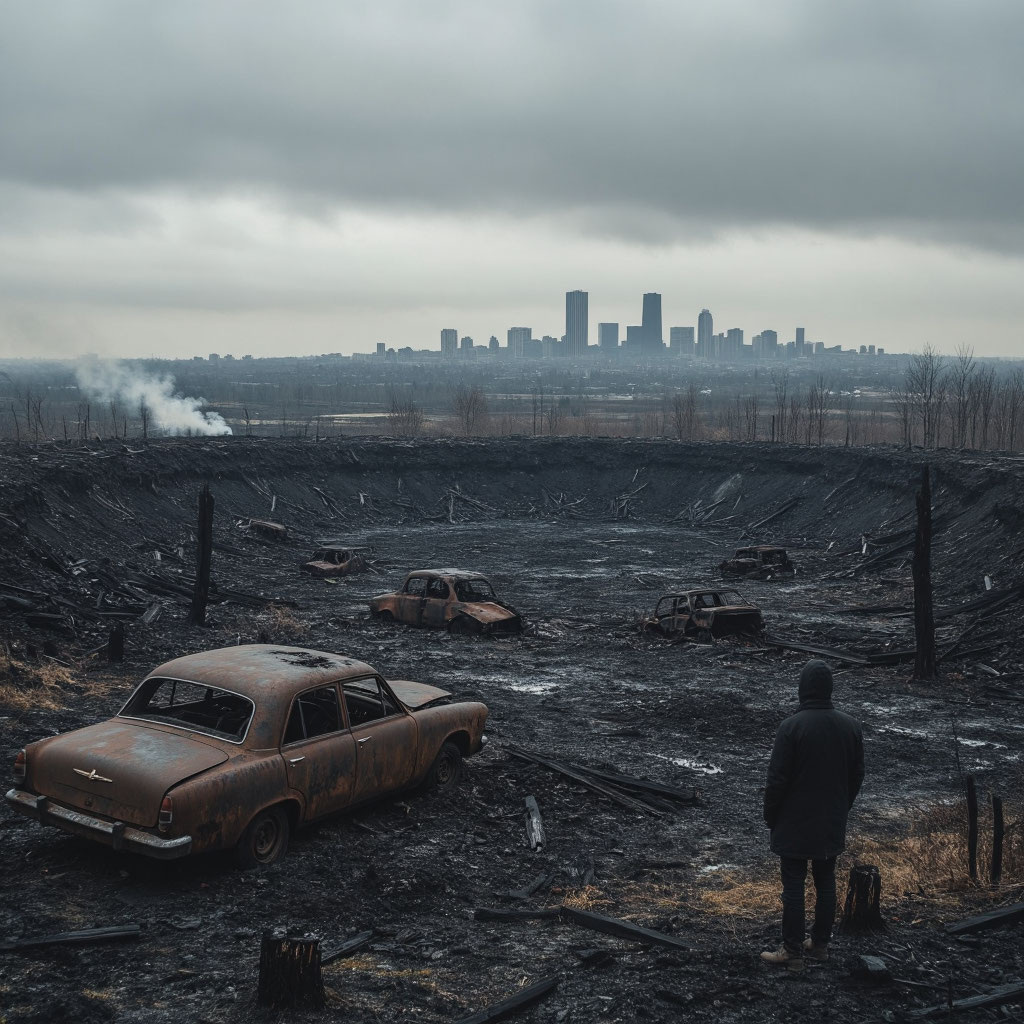Они стояли на краю огромного кратера, заполненного ржавыми остовами машин и почерневшими балками. Над ними висело низкое свинцовое небо, с которого медленно сыпалась серая, похожая на пепел пыль. Всё вокруг было окрашено в оттенки серого и бурого. Ни деревьев, ни травы, лишь изредка торчащие из земли обугленные пни. Вдали вырисовывались силуэты мёртвого города, его пустые глазницы окон смотрели на них с немым укором.