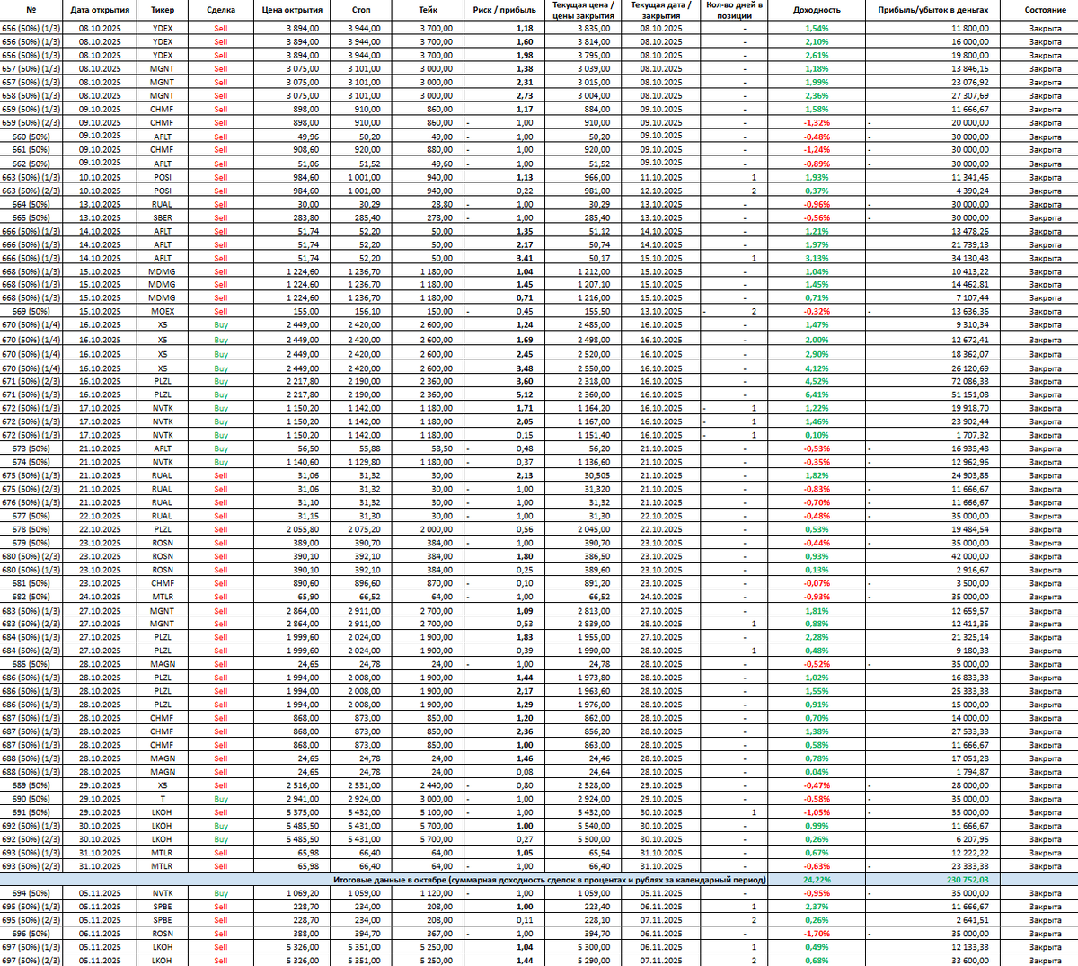 Неделя была короткой – всего 4 сделки, 2 из них убыточные. Несмотря на это, рынок давал возможности заработать. 5 ноября открыл длинную позицию в #NVTK. Акции стояли в боковике 7–9 дней, затем пробили сопротивление 1070 руб. и 200 ЕМА на часовике. Новости о росте экспорта СПГ на 21% и запуске «Арктик СПГ 2» поддерживали идею отскока к ближайшему сопротивлению. Но позиция закрылась по стопу после заявлений членов Совбеза РФ про ядерные испытания. После этого открыл шорт в #SPBE – бумаги традиционно чувствительны к геополитике, связанной с США. Цена пробила локальный восходящий тренд, а накануне не смогла обновить максимумы ЧТ–ПТ. На следующей день акции пошли вниз. Частично зафиксировал прибыль по 223,4 руб. (R/R = 1/3), остаток перевёл в безубыток со стопом 228,1 руб. 7 ноября утром на тонком рынке выбило. 6 ноября открыл шорт в #ROSN. После санкций акции находятся в нисходящем тренде. После пробоя 400 руб. и падения ниже 370 руб. цена отскочила до 397,85 руб. – максимум понедельника н