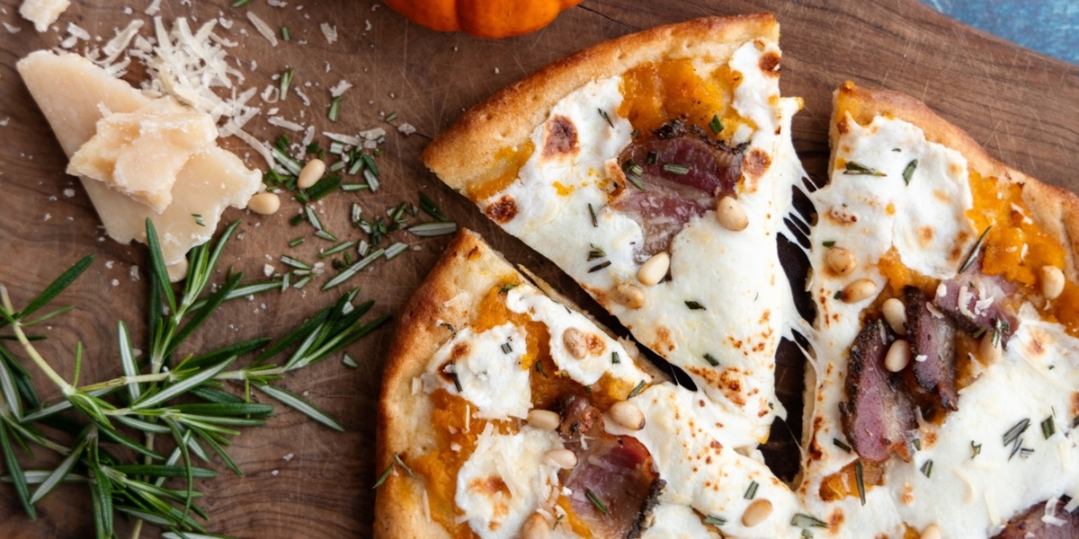 Посоли, поперчи и измельчи в блендере — получится густое ароматное пюре. 3️⃣ Бекон обжарь на сухой сковороде до лёгкой хрустящей корочки, потом выложи на бумагу, чтобы стек жир. 4️⃣ Нарежь моцареллу тонкими ломтиками. 5️⃣ Возьми готовую основу, смажь тыквенным соусом, выложи бекон, сыр и веточки розмарина.