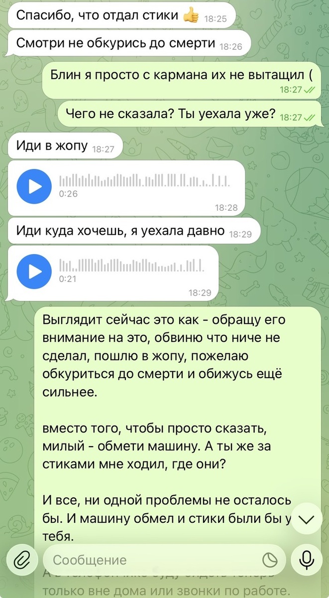Все. Я решился прислушаться к себе и советам тех, кто мне писал в предыдущих постах после вчерашнего утра особенно. Утром. Я проснулся, все хорошо. Собрался, умылся, потянулся, пошёл погулять с собакой. Жена просит заодно купить стиков. Ну ок. Без проблем. Погуляли, на улице снежно, красота. Зашёл в магазин, купил молока, кофе, выпечку, взял стики и пришел домой. Стики сунул в куртку ещё на кассе и забыл выложить. (Не намеренно). Дальше мы занимались уборкой, все тоже в порядке. К вечеру она собралась на работу. Ничего не предвещало, но прилетает сообщение Короче, оказывается, я когда гулял с собакой, не посмотрел, что машину замело. Я должен был об этом подумать, выйти обмести, т.к ей ехать надо. А то, что я не отдал стики - это по ее мнению, чтобы самому сидеть дома и обкуриться до смерти. (Вечно пилит, что я много курю), хотя курит сама. В моей вселенной - на ее месте будь я, я сделал бы так, как написал в сообщении ей. Короче дождался вечером возвращения. Попытался поговорить, расс