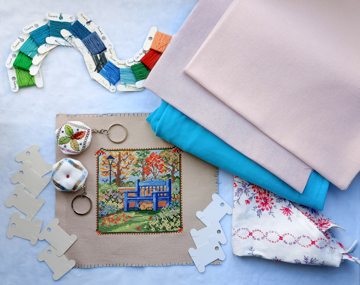 Вышивка по схеме Autumn Bench от Mill Hill с заменой бисера на мулине.