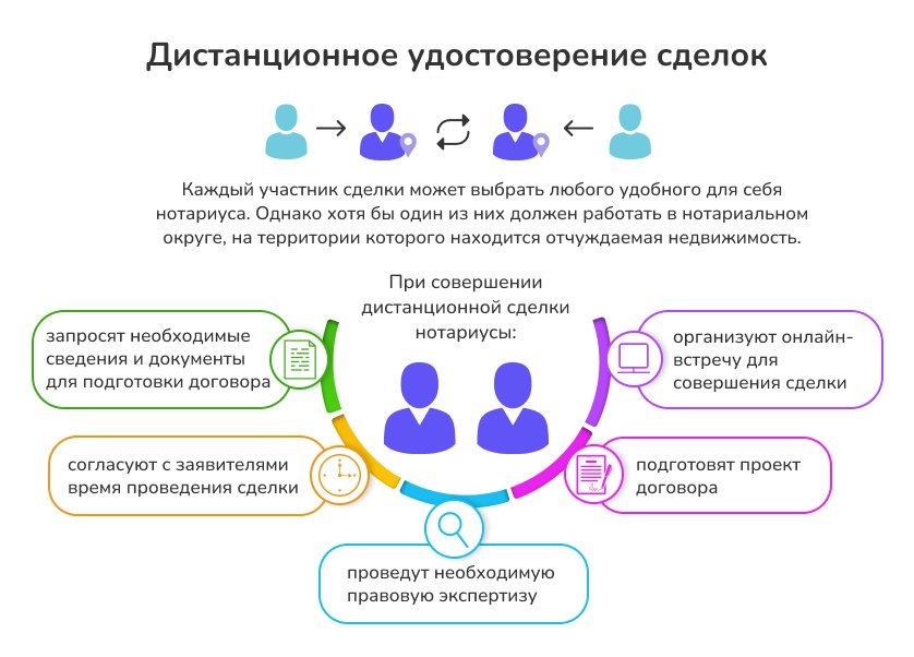 если нотариальная сделка купли-продажи недвижимости удостоверяется дистанционно, то один из нотариусов обязательно должен работать в регионе, где находится этот дом или квартира. Как все происходит? Участники сделки приходят в назначенный час в выбранные нотариальные конторы (каждый - в своем регионе). После этого нотариусы связываются между собой по специальному защищенному каналу видеосвязи. Все необходимые документы стороны предоставляют заранее, чтобы нотариусы могли составить договор. Во время видеовстречи нотариусы зачитывают текст, объясняют значение того или иного пункта и убеждаются, что участники сделки понимают правовые последствия своего решения. После подписания договора сторонами (на планшете с помощью электронной ручки) нотариусы удостоверяют его своими усиленными квалифицированными электронными подписями (УКЭП), после чего отправляют на регистрацию в Росреестр. Сколько времени занимает? В среднем вся процедура занимает 30-40 минут. Среднее время регистрации пе