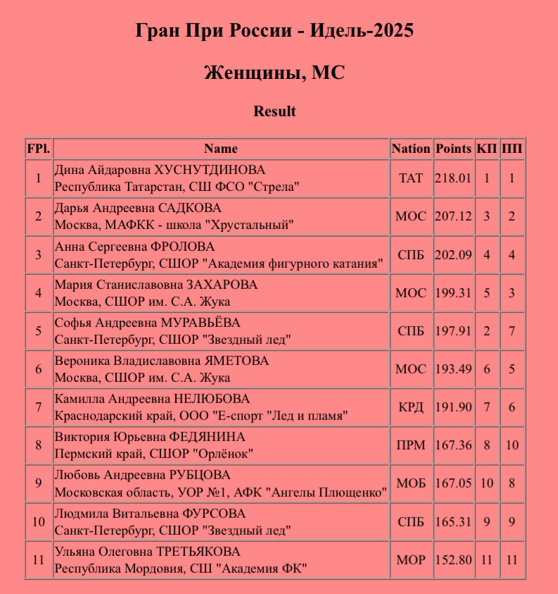 Для фигуристок-одиночниц подошли к концу соревнования в рамках этапа Гран-При в Казани. Пожалуй, это был (пока!) этап с самым интересным составом в соревнованиях женщин. Как же красиво выглядят прыжки в высоких фигуристок. Рост Вики минимум 174, а мне кажется, что даже выше. Буду болеть за Вику на Олимпийских играх в Милане. Шансов на высокие места немного, но в топ-10 попасть реально. 3Lo+2T, 2A, 3S, 3F, 3Lz+3T, 3Lo, 3Lz+2A+2T. 121.39, 183.29. Виктория выступала вне конкурса, её баллы не идут в зачёт. Фигуристка пошла на четверной сальхов. Прыжок приземлила с большим недокрутом. Девушка очень смелая, амбициозная. Очень качественный 4S (недокрут, на минус), 3F, 2A+2T, 3S, 3Lz+3Lo, 3Lz+2A+2T, 3Lo После проката Люба была довольна! Это главное. 111.86, 167.05, девятое место. У Любы «Болеро» в современной интерпретации. Не могу сказать, что очень понравилась сама постановка. Сложная музыка. И даже если это не классическое Болеро Равеля, когда слышишь Болеро ждёшь чего-то невероятного.