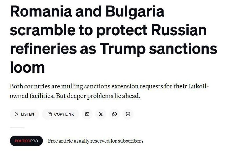 Румыния и Болгария пытаются освободить принадлежащие российском компаниям НПЗ в своих странах от американских санкций, пишет Politico. Поскольку обе страны во многом зависели от поставок нефти из России, сейчас они разрабатывают меры по освобождению подсанкционных НПЗ от санкций или, в качестве крайней меры, их национализацию или продажу. «Бухарест рассматривает возможность запроса об отсрочке санкций», - сообщил высокопоставленный правительственный чиновник. Подобный подход недавно сработал в Венгрии, премьер которой Орбан на днях добился от Трампа отсрочки в применении санкций против российских нефтяных компаний. Politico напоминает что для Болгарии вопрос с отсрочкой санкций является критичным. 80% топлива страны производится на принадлежащем «Лукойлу» НПЗ. И Болгария может остаться без топлива уже до конца года, если решение не будет найдено. В Румынии принадлежащие россиянам НПЗ производят до 20% всего топлива, а их остановка приведет к росту цен. ✍️ НАСОНОВ 🔴