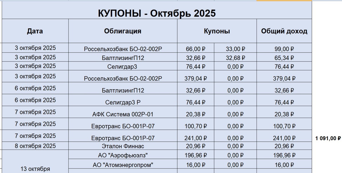 Более подробно показываю мои купонные выплаты за октябрь 2025