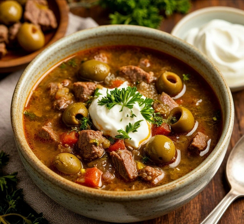 СУП — БЫСТРАЯ СОЛЯНКА С СОЛЁНЫМ ОГУРЦОМ Мяу, мои любители наваристых супчиков! 😺 Когда за окном пасмурное воскресенье, так хочется чего-то согревающего и душевного! Предлагаю собрать все мясные остатки из холодильника и сварганить самую что ни на есть настоящую солянку! Это проще, чем кажется, а результат — просто объедение! 🍲✨ БЫСТРАЯ СОЛЯНКА С СОЛЁНЫМ ОГУРЦОМ ИНГРЕДИЕНТЫ: 🧾 ·Мясные остатки (колбаса, сосиски, ветчина, отварное мясо) – 300-400 г ·Лук репчатый – 1 крупная головка ·Морковь – 1 средняя шт. ·Солёные огурцы – 2 шт. (среднего размера) ·Томатная паста – 1,5 столовые ложки ·Оливки или маслины без косточек – 3-4 столовые ложки ·Огуречный рассол – 4-5 столовых ложек (обязательно попробуйте на сольность) ·Бульонный кубик (говяжий/куриный) – 1 шт. ·Вода – 1,5 литра ·Лавровый лист – 1-2 шт. ·Чёрный перец горошком – 4-5 шт. ·Растительное масло для жарки ·Лимон и сметана для подачи ВРЕМЯ ПРИГОТОВЛЕНИЯ: ⏰ 30 минут СЛОЖНОСТЬ:🐾 Нужна сноровка ПОШАГОВЫЙ РЕЦЕПТ: 👩🍳 1. Подготов