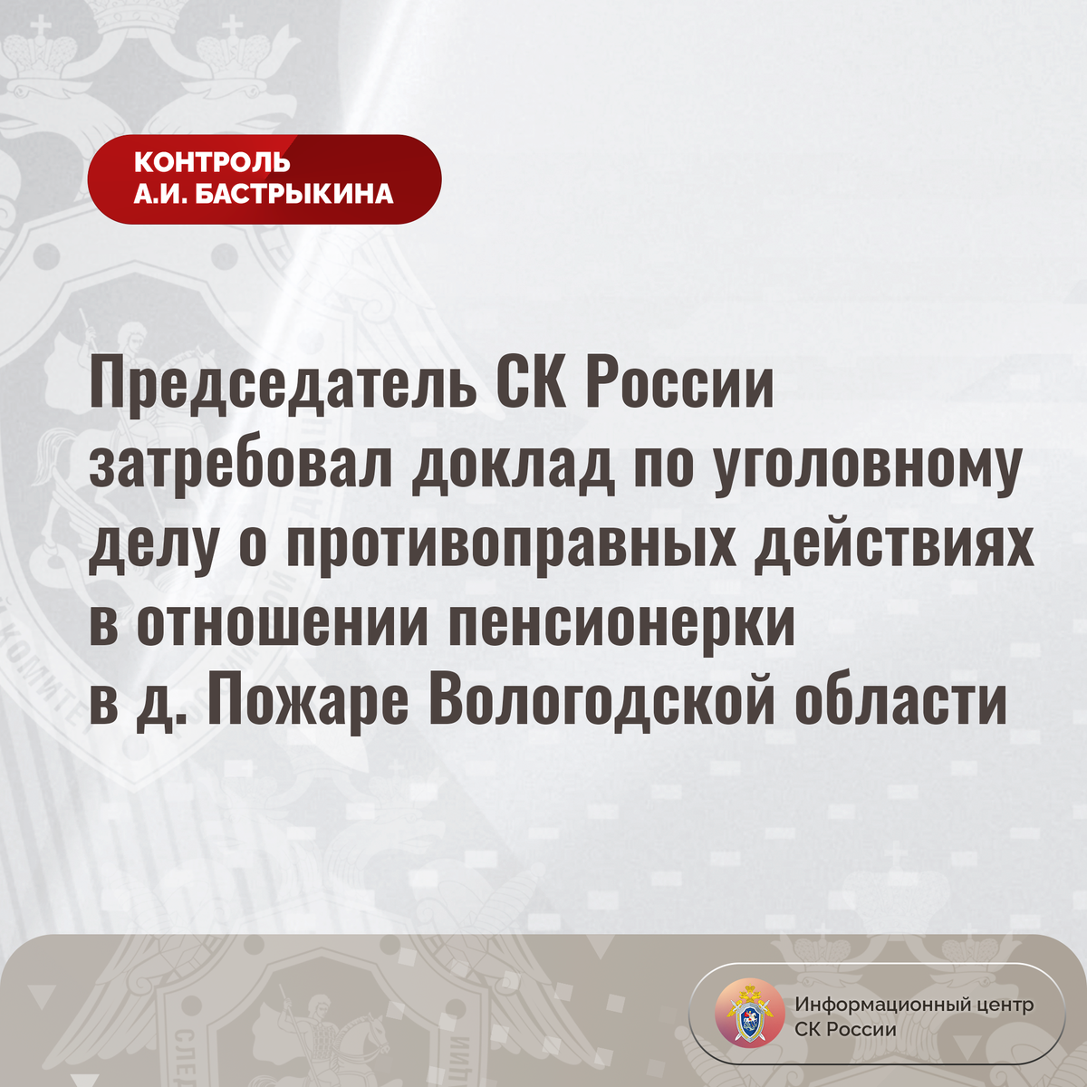 Председатель СК России затребовал доклад по уголовному делу о противоправных действиях в отношении пенсионерки в д. Пожаре