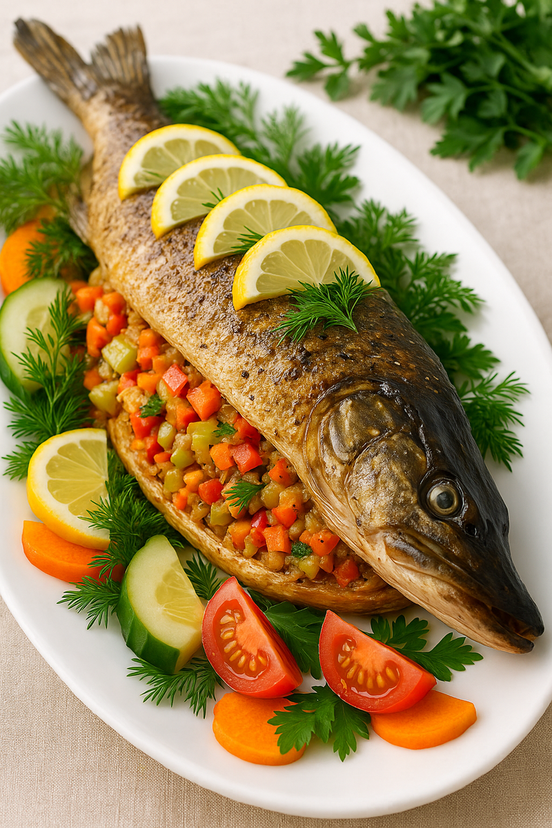 Новогоднее меню мы продумываем особенно тщательно: хочется и красиво, и вкусно, и не слишком сложно. Сегодня поделюсь своим любимым рецептом — щука, фаршированная овощами. Это блюдо всегда вызывает вау-эффект, при этом готовится проще, чем кажется. Я расскажу все нюансы, объясню каждый шаг и раскрою свои секреты, чтобы у вас всё получилось с первого раза. Щука — нежирная, диетическая рыба с плотным мясом, которая отлично держит форму. В фаршированном виде она смотрится празднично, при этом её вкус легко раскрывается благодаря овощам и специям. Такое блюдо подходит и для небольших семейных ужинов, и для большого застолья. Для рыбы: Для овощной начинки: Для подачи: лимон, свежая зелень, хрустящие овощи или лёгкий соус. Если брюшко порвалось — не страшно. Потом можно аккуратно закрепить кулинарной нитью. Секрет: не пережаривайте овощи. Щука готовится быстро, и начинка должна оставаться сочной. Готовность легко проверить: рыба должна быть мягкой, но плотной, а сок — прозрачным. Щука вы