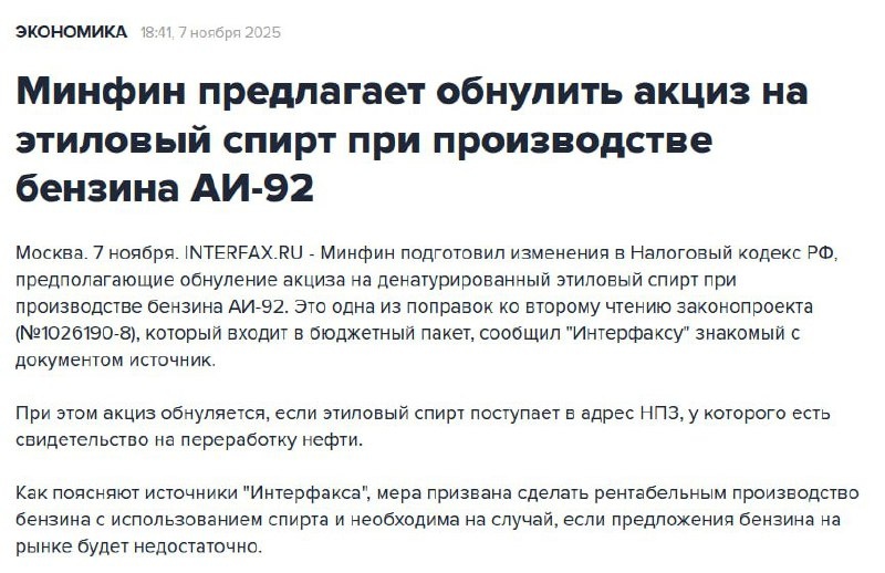 Российским НПЗ разрешат подмешивать спирт в бензин для увеличения поставок топлива на фоне дефицита после атак на заводы. Минфин предлагает обнулить акциз на денатурированный этиловый спирт при производстве бензина АИ-92, чтобы сделать такой бензин рентабельным. Долю спирта в топливе увеличат с нынешних 1,5% до 10%, что позволит добавить на внутренний рынок до 100 тысяч тонн бензина в месяц. В великой сырьевой сверхдержаве бензин будут бадяжить.