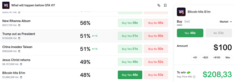 Изучая, как и обещал, перспективы Биткоина на 2026 год наткнулся на чудеса чудесные, шок-контент и халявные деньги. Давайте по порядку. Слышали о платформе Polymarket? Это платформа, позволяющая пользователям делать ставки на исход различных событий, от выборов до спортивных матчей. Так вот, там можно сделать ставку на множество событий, вплоть по пришествие Иисуса Христа (это не шутка). А вчера я наткнулся на удивительные условия ставки. Можно поставить на то, что Биткоин будет стоить 1млн$ раньше, чем выйдет GTA VI и получить за это х2 (более 100% годовой доходности). С одной стороны – это просто спор, где не ясно кто окажется победителем. А с другой стороны – это просто халявные деньги и сейчас я объясню почему. Как с вероятность в 100% получить прибыль используя платформу Polymarket? Даю упрощенные, но в целом верные расчеты. Допустим, у Вас есть 2 000$: