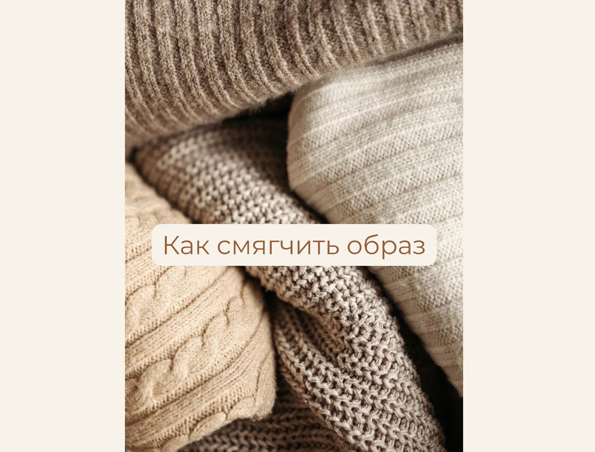 Иногда образ вроде бы собран правильно: базовые вещи, спокойные цвета, никакого «крика». Но смотришь в зеркало — и что-то не то. Силуэт получается жёстким, угловатым, «колючим». На самом деле дело не в одежде, а в фактурах. Есть материалы, которые визуально делают образ жёстче: А есть фактуры, которые смягчают лицо и делают образ уютнее: То есть иногда не нужно менять весь гардероб — достаточно добавить одну мягкую фактуру, и образ сразу «садится» по-другому. Пример Вот такой свитер — правильная фактура для мягкого образа: пушистый, объёмный, светлый. Он не подчеркивает жёсткие линии лица, не делает образ «квадратным», а наоборот — создаёт эффект «воздуха». Как внедрить принцип в свои образы: Попробуй просто заменить одну вещь: Было: плотный тёмный свитер или худи Станет: мягкий пушистый свитер / светлый трикотаж Было: чёрные узкие джинсы Станет: свободные брюки или прямые джинсы Было: резкая экокожа Станет: матовая или более мягкая текстура Эффект: образ становится теплее, ж