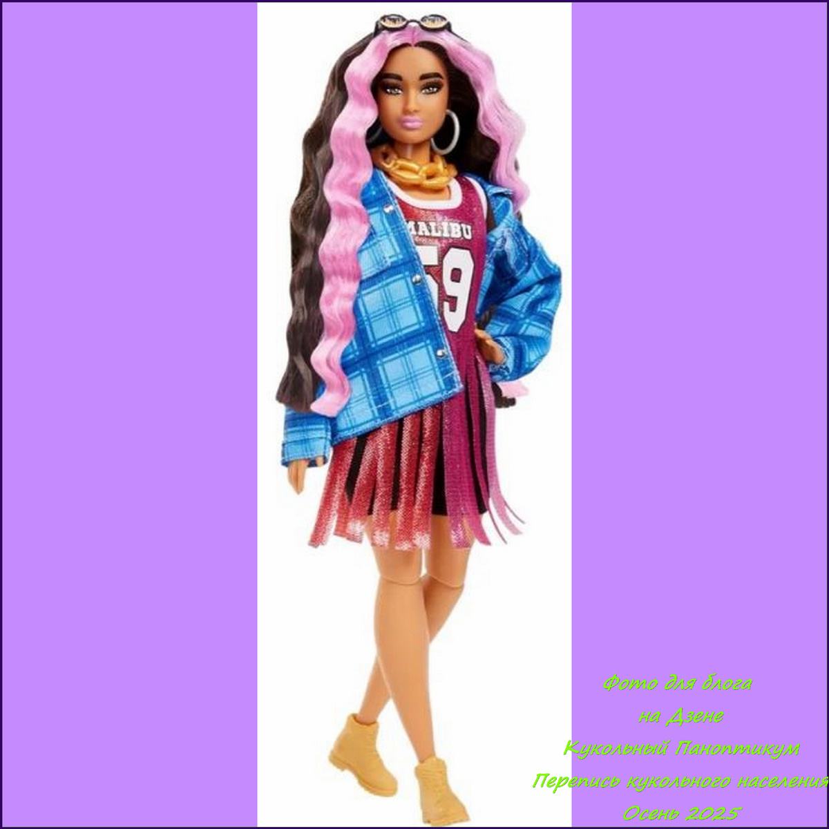 Приветствую всех ценителей кукольной моды и поклонников уличного стиля! Добро пожаловать в "Кукольный Паноптикум", где сегодня мы будем забивать трехочковые вместе с Barbie Extra #13! Сегодня мы рассмотрим Barbie Extra #13 от Mattel, одетую в эффектный баскетбольный образ! Эта кукла сочетает в себе гламур и спортивный стиль, доказывая, что можно быть яркой и модной в любой ситуации! Barbie Extra #13: Играй по своим правилам! Barbie Extra – это серия, которая призывает к самовыражению и любви к моде, не стесняясь быть собой. Barbie Extra #13 – отличный пример этого! Внешность: · Тип: Кукла Barbie. · Тело: Крепкое (спортивное, не худое) тело Barbie с подвижными суставами. · Лицо: У Barbie Extra #13 латино-американский молд лица с выразительными глазами с азиатским разрезом и пухлыми лиловыми губами. · Кожа: Цвет кожи - латино. · Волосы: Barbie Extra #13 длинные темные волосы с розовыми прядями. · Макияж: Яркий макияж с акцентом на глазах, губах и бровях. Одежда (в баскетбольном стиле): ·