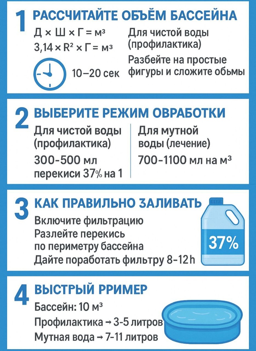 Если соблюдать дозировку — вода всегда остаётся прозрачной, без запаха и зелени. Формула одинаковая для любых бассейнов. --- ✅ 1. Рассчитайте объём бассейна Прямоугольный: Д × Ш × Г = м³ Круглый: 3,14 × R² × Г = м³ Овальный / сложный: Разбейте на простые фигуры и сложите объёмы. Это занимает 10–20 секунд. --- ✅ 2. Выберите режим обработки Для чистой воды (профилактика): 300–500 мл перекиси 37% на 1 м³ Подходит, когда вода прозрачная, без запаха. --- Для мутной воды (лечение): 700–1100 мл на 1 м³ Используется при: – помутнении – зеленоватой воде – запахе – скользких стенках --- ✅ 3. Как правильно заливать ✅ Включите фильтрацию ✅ Разлейте перекись по периметру бассейна ✅ Дайте поработать фильтру 8–12 часов ✅ Через сутки вода станет кристальной --- ✅ 4. Быстрый пример Бассейн: 10 м³ ✔️ Профилактика → 3–5 литров ✔️ Мутная вода → 7–11 литров --- ✅ 5. Что важно помнить 🔹 Перекись не работает в стоячей воде — нужна циркуляция 🔹 Не используйте 3% — она слабая 🔹 Не накрывайте бассейн первые