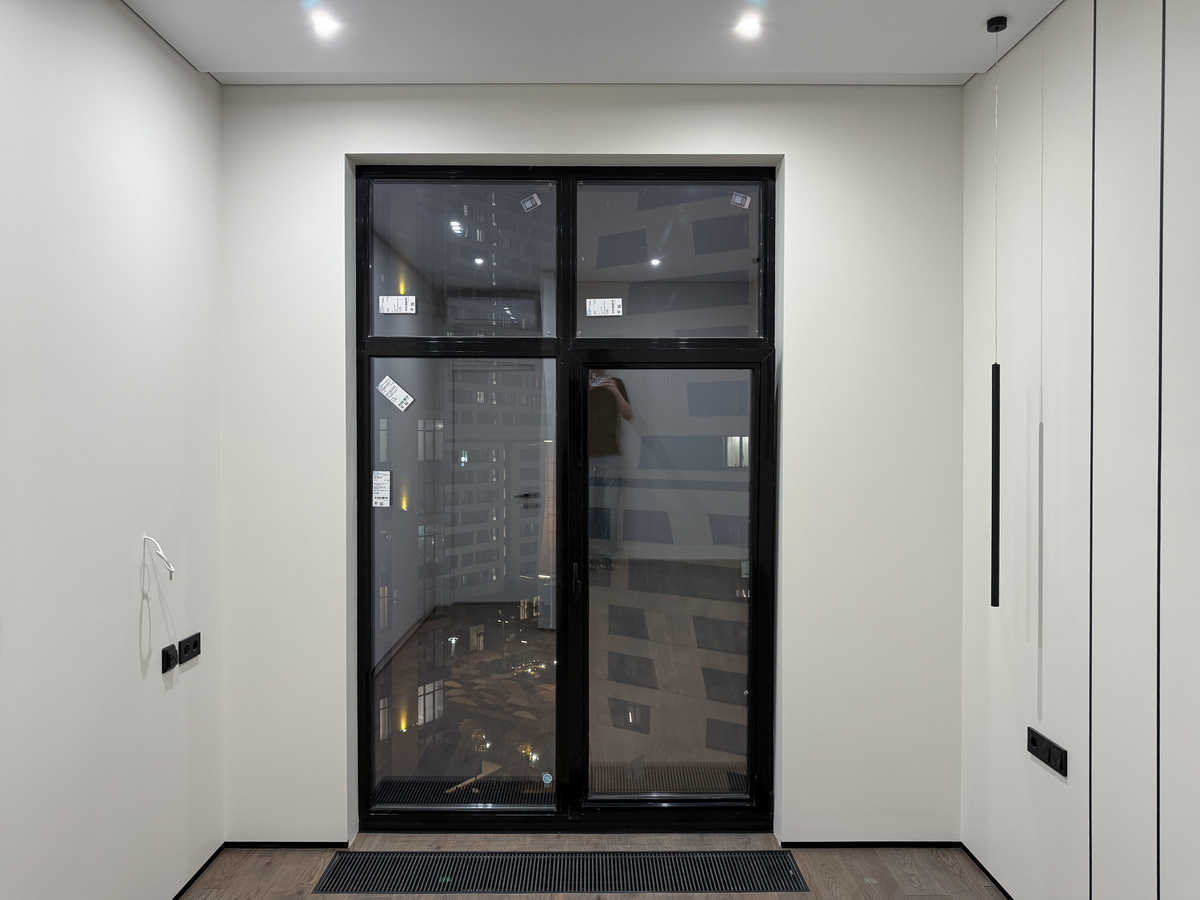 Стены покрашены краской IN 720 в нейтральный светло-бежевый оттенок, без бликов и полос. Двери на скрытом коробе, окрашены в цвет стен, фурнитура чёрная матовая. Розетки и выключатели Schneider AtlasDesign расставлены зеркально.