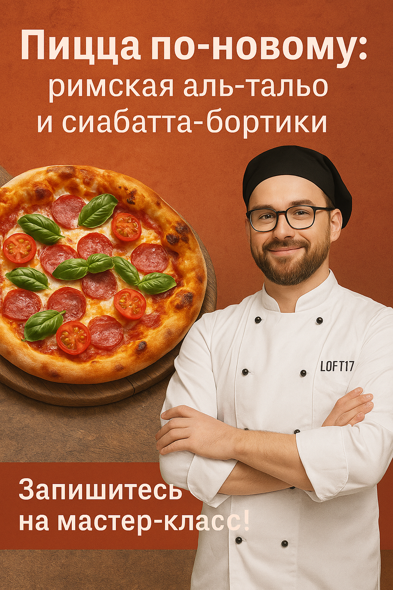 Пицца — это любовь. Но в Loft17 мы любим не просто повторять классические рецепты, а открывать новые грани привычных вкусов. На мастер-классе «Пицца по-новому» вы узнаете, что пицца может быть лёгкой, воздушной и абсолютно непохожей на привычную. Мы будем готовить римскую аль-тальо и пиццу с чиабатта-бортиками — два шедевра, которые перевернут ваше представление о тесте, начинках и подаче. Название al taglio переводится как «на кусочки» — такую пиццу пекут на больших противнях, нарезают квадратами и подают на улице с чашкой эспрессо. Это не тонкая неаполитанская лепёшка, а хрустящее тесто с нежной, пористой структурой, которая буквально танцует под соусом и сыром. На мастер-классе вы узнаете: Мы приготовим несколько вариантов аль-тальо: Эта версия родилась на границе Италии и креативности. Мы берём тесто по принципу чиабатты — влажное, долгое брожение, насыщенный аромат — и превращаем его в основу для пиццы с воздушными бортиками. Каждый кусочек словно облако, с идеальным балансом текс