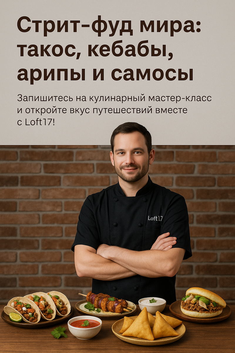 Еда, которую едят на улицах, — это настоящая гастрономическая поэзия. Она передаёт дух страны, её энергию, настроение и вкус жизни. На мастер-классе Loft17 «Стрит-фуд мира» вы отправитесь в кулинарное путешествие по четырём континентам, чтобы своими руками приготовить самые популярные уличные блюда — мексиканские такос, турецкие кебабы, венесуэльские арипы и индийские самосы. Такос — это взрыв вкусов. Нежное мясо, острые соусы, лайм, кориандр и мягкая тортилья — в каждом кусочке солнце и праздник.