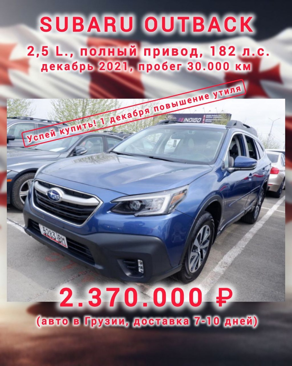 Всем привет 👋 1 декабря вступает в силу изменения в начислении утилизационного сбора. Цены на ввозимые авто мощностью свыше 160 л.с. - улетят в космос. Сейчас ещё есть время приобрести себе авто мощнее. Но только в Грузии. Вот пример автомобиля из наличия: SUBARU OUTBACK 2,5 литра, 182 л.с., полный привод, пробег 30.000 км(!), декабрь 2021 года. Конкретно этот вариант обойдется "под ключ" в 2.370.000 руб. (В РФ цена 3 млн.) После 01.12.25 к этой цене нужно будет прибавить ещё 2.300.000 руб. Нужно успеть! Телефоны: +79253033939 Валентин +79272766284 Сергей Наш сайт: авто-из.рф