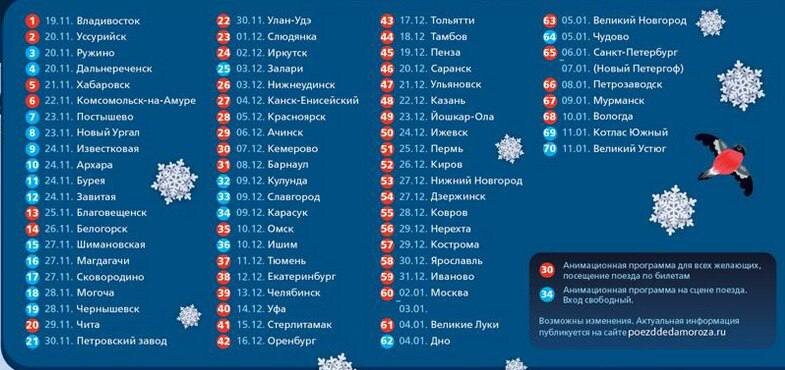 Поезд Деда Мороза прибудет в Омск 10 декабря. Только что на сайте РЖД открыли продажу билетов на праздничные представления внутри вагонов. Организаторы предупредили, что количество билетов ограничено — на одном сеансе в передвижной резиденции Деда Мороза смогут побывать 15 человек, на сеансе в Кукольном театре — 26 человек. Во все предыдущие годы билеты раскупали мгновенно. В Омск поезд прибудет утром. Первое представление начнется в 9:40, последнее - в 13:20. Стоимость билета на ребенка от 6 до 12 лет - 2,9 тыс. рублей, на ребенка от 3 до 5 лет с сопровождением - 3,5 тыс. рублей. Поучаствовать в активностях на перроне могут все желающие — это бесплатно. Поезд начнет путь во Владивостоке 19 ноября и закончит в Великом Устюге 11 января. Новости Омска. Подписаться