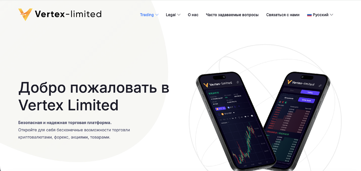 Платформа Vertex Limited позиционирует себя как “международный брокер”, предлагающий доступ к онлайнторговле, инвестициям и высокодоходным стратегиям. На сайте указаны обещания: “профессиональные аналитики”, “гарантированная доходность”, “лицензия и регулирование”. Однако при проверке обнаруживаются серьёзные тревожные сигналы.
