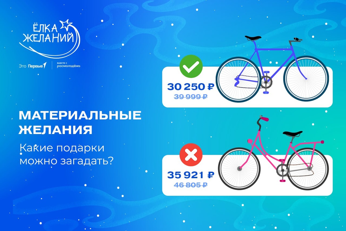 🎁 Разбираемся в материальных желаниях: правила и частые вопросы Исполнители акции – это обычные люди, и, чтобы желание имело больше шансов сбыться, для материальных подарков установлены разумные ценовые лимиты. Однако, чем умереннее цена подарка, тем выше вероятность, что исполнители выберут именно вашу заявку. 💰 До 20 000 ₽ – развивающие материалы и книги, товары для хобби, одежда и наряды 💰 До 30 000 ₽ – детские и развивающие игрушки 💰 До 40 000 ₽ – спортивный инвентарь и музыкальные инструменты ⚠️ Важно: При подаче заявки учитывается исходная цена без скидок. Например, если спортивный инвентарь стоит 35 921 ₽, но зачеркнута изначальная стоимость 46 805 ₽ – такой подарок превышает лимит. Почему? Потому что скидка может закончиться, когда исполнитель будет оплачивать заказ. Также собрали несколько подарков, по которым часто возникает вопрос: к какой подкатегории это относится? • Смарт-часы – товары для хобби ИЛИ спортивный инвентарь • Умные колонки – товары для хобби ИЛИ музы