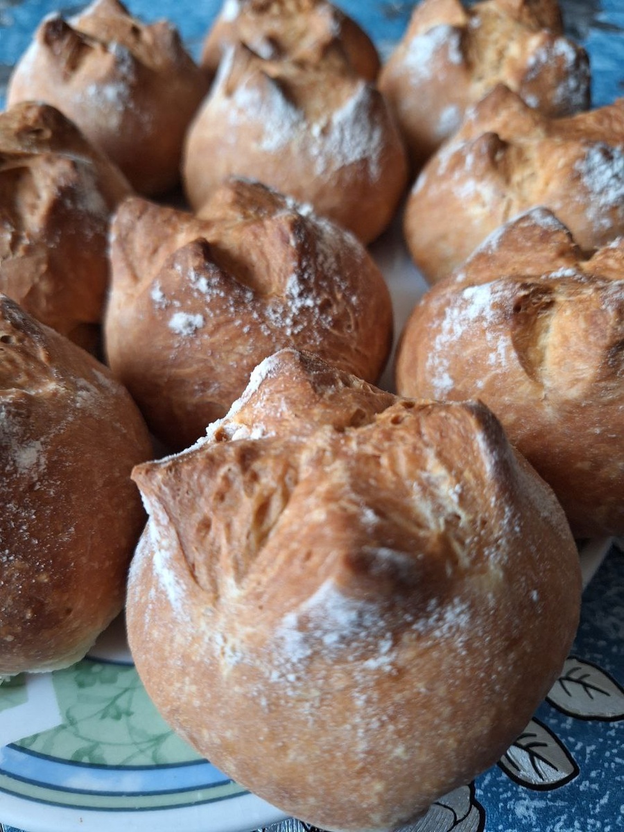 Замешиваем мягкое тесто, накрываем и оставляем на 40-50 минут. Обминаем и делим на 10 кусочков, формируем круглые булочки, перекладываем в смазанный маслом и присыпанный мукой противень, оставляем на 10 минут, затем делаем произвольно надрезы и отправляем в разогретую духовку на 190 гр, запекаем 25-30 минут. Готовые булочки накрываем полотенцем и даем не много остыть, минут 15. Приятного аппетита!