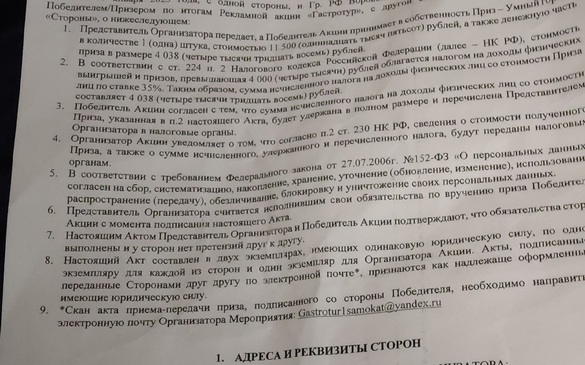 Итак, я действительно не только выиграла приз от "Самоката", но и получила его. Правда, не без некоторых нюансов. Сам приз состоял из двух частей. Так называемый "умный горшок" и некая денежная сумма в более чем 4 000 рублей, которая идет на уплату налога. Дело в том, что если какой то выигрыш составляет более 4 тыс р, то с него уплачивается налог в 35 %. Тут с меня требуются персональные данные и отправляется информация в налоговую. Если налоговой не нравится документы, которые с меня потребовали подписать, то налог должна уплатить я сама. Ну ну... Короче с этим возникли проблемы. Приз пришел в пакете и акт приема был взредебезги помят. С трудом я пыталась его как то разгладить, подписала и сфотографировала. И тут мне пишут, что налоговая такую измятую бумагу не примет. А я причем? Короче, по итогу пришлось просить друга сходить и где нибудь отсканировать, чтобы Самокату послать приличное фото. На удивление, со сканированием справились на "5+". Даже ничего не заметно было. Но стре