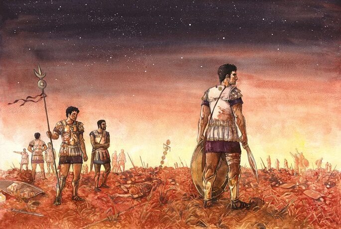 Битва при Каннах (2 августа 216 года до н. э.) — одно из самых значимых сражений Второй Пунической войны, ставшее вершиной полководческого искусства Ганнибала Барки. Это поражение Римской республики стало крупнейшим в её истории, но не привело к победе Карфагена в войне. После перехода через Альпы в 218 году до н. э. Ганнибал последовательно разгромил римские армии при Тицине, Требии и Тразименском озере. К 216 году до н. э. Рим, стремясь переломить ход войны, собрал огромную армию из 16 легионов (около 87 тысяч пехотинцев и 6 тысяч кавалеристов) под командованием консулов Луция Эмилия Павла и Гая Теренция Варрона. Ганнибал располагал примерно 50 тысячами воинов, включая африканскую, испанскую и галльскую пехоту, а также мощную конницу. Римская армия расположилась на левом берегу реки Ауфид (современный Офанто). Консул Варрон, командовавший в день битвы, решил атаковать карфагенян, несмотря на возражения Эмилия Павла, который предлагал более осторожную тактику. Ганнибал построил свою