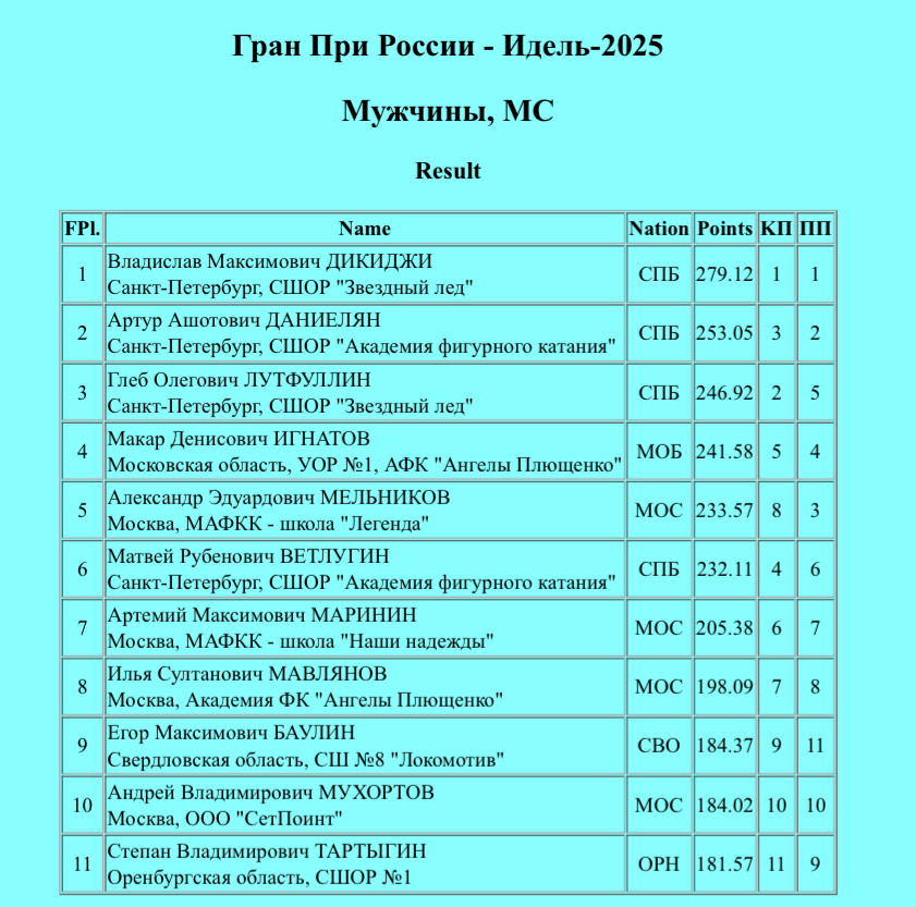 Завершились соревновани мужчин в рамках третьего этапа Гран-При России «Идель». Фигуристы порадовали. Было много классных прокатов. Моя личная радость — медаль Артура Даниеляна. Это серебро дороже золота. Очень хотелось, чтобы после неудачной короткой программы Саша собрался и всё удалось. Это очень важно для фигуриста и его настроя на следующие соревнования. Молодец! Полезный опыт. 4Lz, 4T+2T, 3A, 3S, 4T+3T, 3A+2A+2A, 3Lz. 164.97, 233.57, пятое место. Саша третий в произвольной программе. Но неудача в короткой программе не позволила бороться за пьедестал. Фигурист здорово проявил себя на этапах в Красноярске и Казани. Понравилась постановка и непосредственно катание Артемия. Ему, конечно, нужно усложняться. Без четверных претендовать на медали не приходится. Такой длинноногий молодой человек, наверное, непросто собирать прыжки. Прямо балетные пропорции у Артемия. 3A+2T, 3A, 3S, 3F, 3Lz+3T (на минус), 3Lo (на минус), 3Lo+2A+2A 135.65, 205.38, седьмое место. 4Lo, 4S (на минус), 4