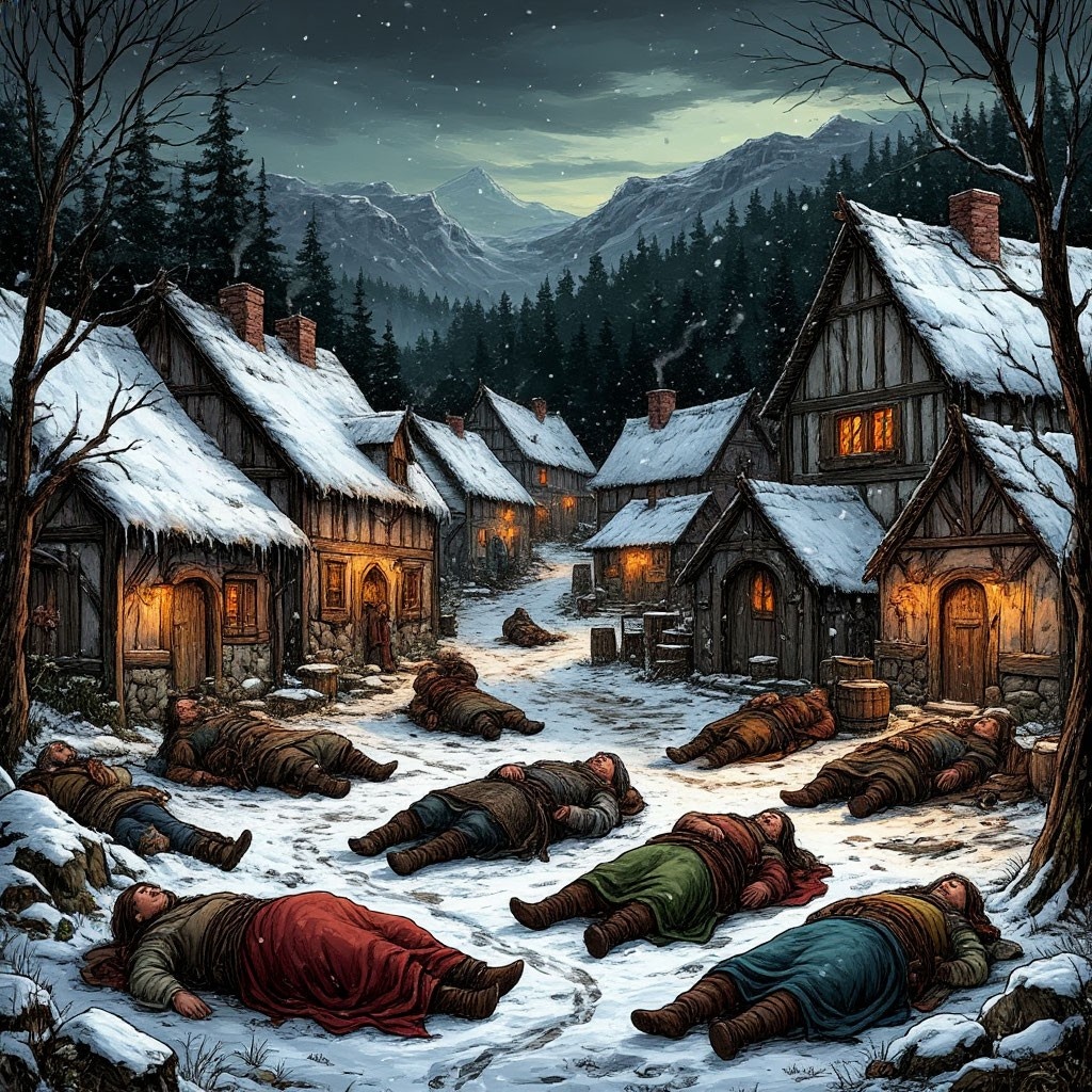 Так вот, Торговка и Лучник начали обследовать дома, где обнаружили забившихся в подвалы детей — измождённых и истощённых, но живых. Все они были младше десяти лет. Дети рассказали, что накануне был праздник, и в деревню приехали какие-то торговцы, которых сами дети не видели. Родители, оставленные дома, внезапно начали ломиться внутрь, словно одержимые. Дети спрятались в погребах и чуланах, выбираясь лишь изредка за куском хлеба или сыром.