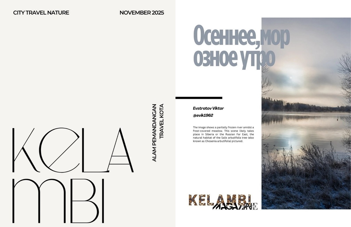 Снимки, запечатлевшие осеннее утро в ноябре, на величественной русской реке Волге, вызвали восторг у редакции печатного,глянцевого журнала, и они решили опубликовать их в своём ноябрьском номере. Журнал KELAMBI Magazine (Бекаси-Индонезия). Ноябрьский выпуск "Город, путешествия и природа", представил серию фотографий под названием "Осеннее, морозное утро". 5 ноября 2025г. Фотографии сделаны в окрестностях д.Святье.
