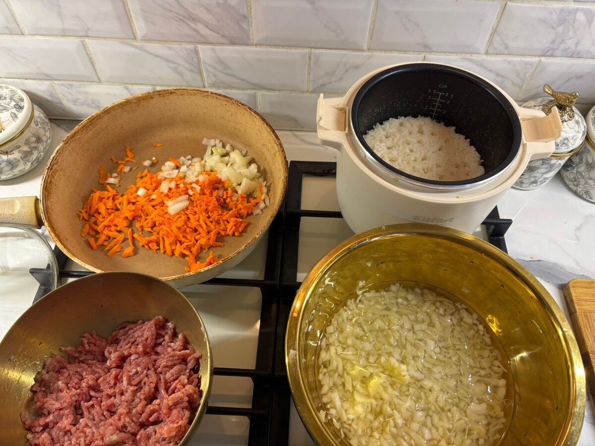 Классические голубцы в целых листьях капусты, как говорят историки, пришли к нам из Франции. Изначально, как говорят, в капустные листья оборачивали тушки голубей. Потом этот рецепт подстроили под более доступный фарш. Так появился рецепт классических голубцов. Но если вам не хочется заниматься заворачиванием начинки в листья, или ваши домашние не очень жалуют капусту, можно приготовить вот такой упрощенный рецепт. Ингредиенты: Мелко шинкуем капусту. Выкладываем в миску и немного мнем её чтобы она стала помягче и заливаем кипятком так, чтобы кипяток покрывал капусту на пару сантиметров сверху. Пока капуста парится, подготавливаем фарш, если у вас кусок мяса и ставим вариться рис. Для быстроты берем пропаренный рис, он уже промыт и готов. Если берете обычный, надо его промыть 2-3 раза проточной водой. Варим рис до состояния аль денте (то есть слегка недоваренный, с твердой серединкой). Собираем наши голубцы. Смешиваем процеженную капусту, рис и фарш. Капустный сок еще нам пригодитс