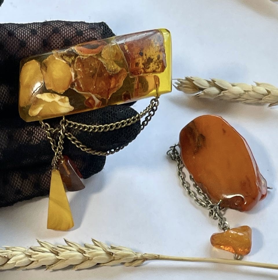 Сегодня мне захотелось вам показать несколько брошей, каждая из которых, я считаю, по-своему интересна и формой, и наполнением. Одна похожа на мозаику из плавленого янтаря с вкраплениями цельных фрагментов. Такие «пейзажные» переливы часто встречаются в изделиях 70–80-х годов. Вторая - насыщенного, плотного цвета «желток», природный янтарь без обработки, тёплый, матовый, будто хранит в себе солнечное тепло. Обе броши украшены подвесками на металлических цепочках. 2. Вот ещё одна очень милая брошь в форме кокошника, изысканная и женственная. Сделана на Красносельской ювелирной фабрике в 1960–1970-е годы. Латунь, пять стеклянных вставок с мягким аметистовым оттенком и круглой огранкой. При дневном свете они отливают чуть холоднее, а в тёплом освещении становятся почти розовыми. Размер броши 4×3,5 см. Все камни на месте, на застёжке клеймо МК6. Металл хранит лёгкие следы времени, но для шестидесятилетней броши выглядит она чудесно. Можно носить её с пиджаком, пальто, шерстяным платьем