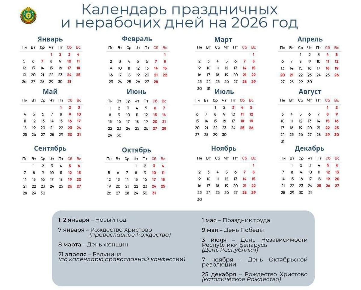 Календарь выходных и перенос рабочих дней в Беларуси в 2026 году. Посмотреть