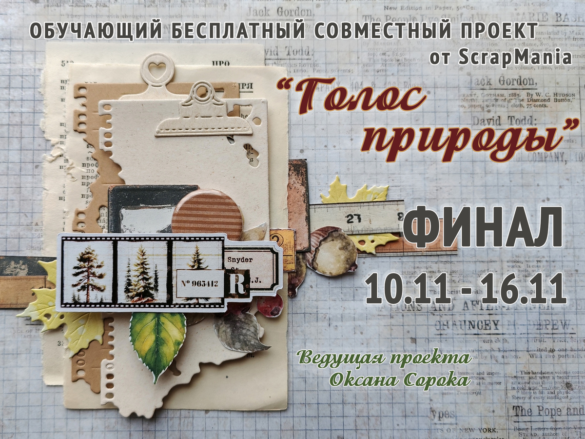 Сегодня мы заканчиваем наш бесплатный обучающий совместный проект "Голос природы"/#SM_спГолосПрироды с Оксаной Сорока. На нашем проекте мы создали уютный скрап-альбом, сочетающий в себе ботанику с яркими осенними нотками. Наш альбом сделан из коллекции "Голос природы" и дополнительных листов из коллекций "Школьная жизнь" и "Тайга". ❗ Обратите внимание: финальный этап длится неделю (7 дней). Ваши развороты сделаны, обложки и переплеты готовы. Эта неделя дается вам на завершение и сборку альбома. Обращаю внимание участников с ВКонтакте: обязательно откройте вашу страничку и проверьте чтобы была возможность оставлять комментарии! Сегодня мы показываем весь альбом - странички и обложку. И обязательно все наши ОЭ (обязательные эелемнты), озвученные в прошлых постах. А еще мы даем время тем, кто немного отстал и опоздал, наверстать и доделать свои странички. На все это мы вам даем 7 дней! А теперь про призы: Привет, мои творческие друзья! Немного грустно, что наш совместный проект "Голос При