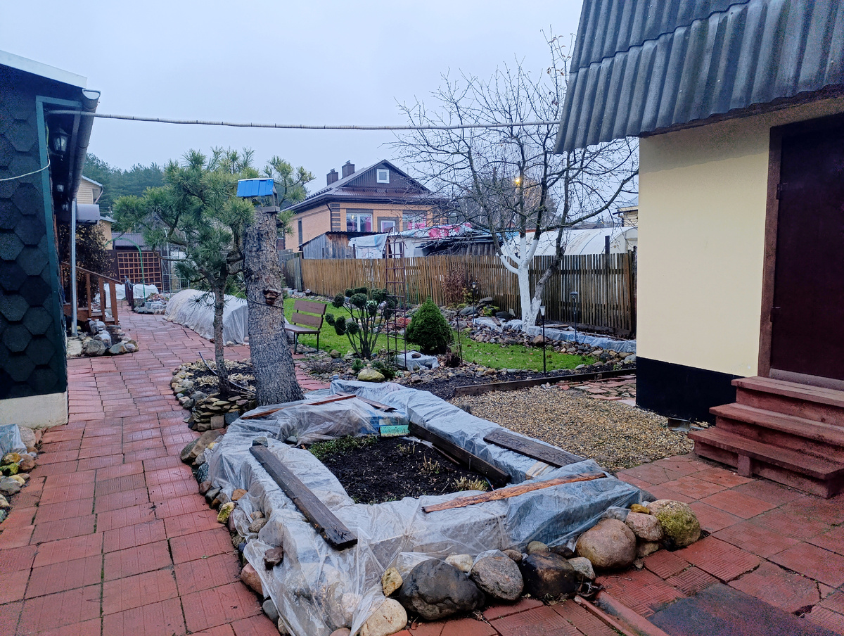 Как бодро я шуровала в саду летом, так же жестко лень мне сейчас, даже выйти туда лишний раз. Вот кому можно вообще не заботиться насчет осенней красоты. Читаю, как другие подбирают растения специально для осенних композиций, и радуюсь, что хоть это мне можно не делать. Весь сад уже умотан в ящики, в пленки, в укрывной, смотреть там нечего. И некому - быстро проскакиваем из калитки, и домой. Но оставалось несколько недоделанных территорий. И самая главная - розарий. В розарии нынче зимуют и гортензии, и некоторые клематисы, а также там осуществляется идея из завирального - зимует львиный зев Твинни и Снеппи. Если вдруг это получится, во что не особо верю, будет просто круто. Так вот, розарий стоял в тоннеле под армированной пленкой, сушился. Обычно я закрываю его после первых более-менее длительных заморозков. Заморозки обещают через три дня, а я послезавтра уезжаю. Поэтому решили все закрыть сейчас. Стояли же розы в укрытии в прошлом январе, когда весь месяц был плюс, пополам