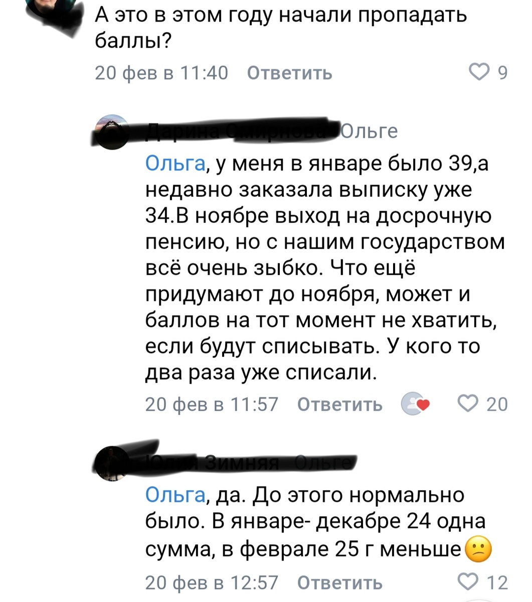 Неприятным сюрпризом для меня стало открытие, что пенсионные баллы могут исчезнуть. Писала об этом тут: Я решила, что три балла у меня списали из-за того, что три года не работала. Эту причину мне подсказала Алиса. В комментариях написали ещё одну причину, по которой пенсионные баллы могут уменьшить - перерасчёт начисленных за детей. Стала искать информацию в интернете и наткнулась на чат, где обсуждали эту проблему. И непонятно почему! Интересно, что ПФР отвечает на комментарии, но предлагает обратиться с проблемой лично. Кому-то сделали перерасчёт, кто-то ещё ждёт объяснения. Не только из-за детей уменьшили баллы и у мужчин пропали! А ведь многие люди даже не интересовались, сколько баллов у них накоплено.Честно работаешь за приличную зарплату и не подозреваешь, что у тебя может получиться вот так: С баллами за детей интересная ситуация получается. У нас пропагандируют многодетность и уверяют, что государство помогает таким семьям. Может в крупных городах есть поддержка для ВСЕХ м