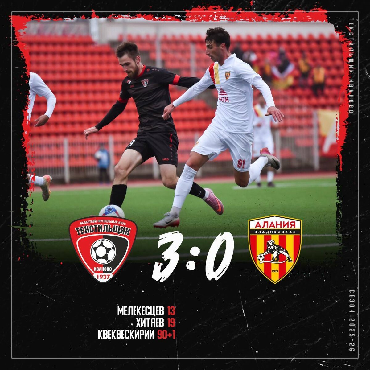 Ивановский «Текстильщик» разгромил команду «Алания-Владикавказ» 9 ноября в Иванове состоялся футбольный матч «Текстильщика» с командой «Алания-Владикавказ». Игра завершилась победой нашей команды со счетом — 3:0. «Красно-черные» открыли счет на 13-й минуте: форвард Тимур Мелекесцев забил гол. На 19-й минуте игры Андрей Хитяев забил второй гол в ворота соперников. На перерыв ивановцы отправились со счетом на табло 2:0. Во втором тайме на 91-й минуте матча Даур Квеквескири забил третий и решающий гол. Фото: ФК «Текстильщик»