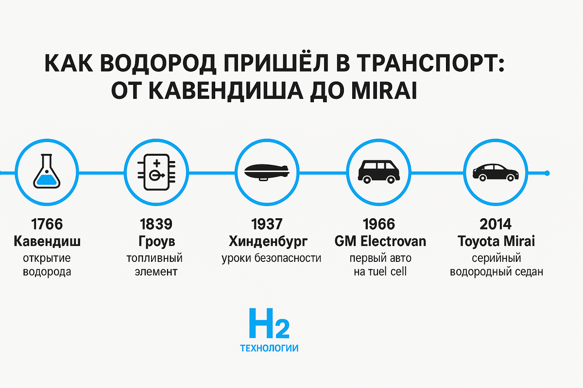 В 1766 Генри Кавендиш описал «воспламеняющийся воздух», который при сгорании даёт воду. Позже Лавуазье дал газу имя Hydrogen. С этого момента стало понятно: водород сгорает, а на выходе вода. Ключевой вопрос всегда был один - как получать его дёшево и безопасно доставлять. В XIX веке Уильям Гроув показал обратный процесс: из водорода и кислорода можно получать электричество. Так родилась идея топливного элемента - источник тока, который «ест» водород и «выдыхает» воду. Концепция работала, но до транспорта ей были нужны десятилетия материаловедения. XX век принёс и романтику, и страх. В 1937 взорвался дирижабль «Гинденбург» - событие ударило по имиджу водорода на десятилетия. Разборы причин идут до сих пор: от статического электричества и свойств оболочки до иных версий, но общий урок один - безопасность и контроль среды критичны. В 1966 GM построила Electrovan - первый в мире автомобиль на топливных элементах. Он ехал, имел запас хода около 150 миль и разгон до 60 миль в час за 30