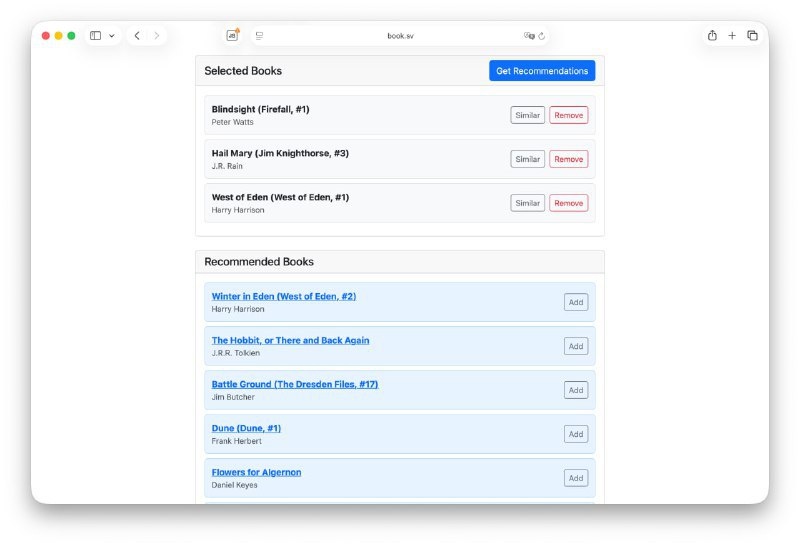 Парень собрал 3 миллиарда рецензий на книги и создал отличный сервис рекомендаций. Вам всего лишь нужно выбрать несколько любимых произведений, а алгоритм подберет для вас максимально подходящие книги. Заполните свою книжную полку здесь. Постмейкер - автоматическое ведение канала 🤖 Анимация | СhatGPT-4 | Помощь с резюме