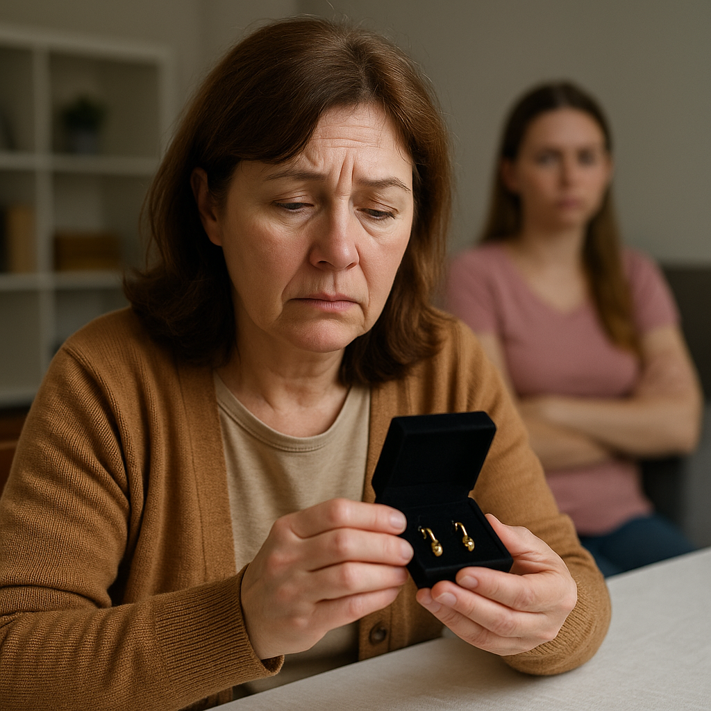 Мне 56, зовите Татьяной. Мужа нет уже пять лет. Есть одна дочка - Лера, в этом июне вышла замуж. На свадьбу я от сердца отдала ей самое дорогое семейное - золотые серьги свекрови. Тонкая работа, крошечные алмазы, внутри - крошечная гравировка "Л.Т. 1983". Мы в семье всегда говорили, что это "женское кольцо памяти": кто взрослеет - той и переходит. Через неделю после банкета в субботу крутила ленту объявлений - ищу б/у морозилку на дачу. И вдруг у меня будто сердце провалилось: на экране - наши серьги. Фото такое близкое, что видно ту самую царапинку на застёжке и гравировку. Цена - 58 тысяч. Подпись: "Подарок не подошёл по стилю". Я даже телефон выронила. В голову сразу шум полез: может, совпадение? Но нет. Это они. Позвонила Лере. Голос веселый, как будто ничего. Спрашиваю прямо: "Ты серьги продаёшь?" Секунда тишины, потом: "Мам, не начинай. Нам сейчас каждая копейка нужна: коляска, кроватка, задаток за съём. Серьги - это красиво, но мы живём в реальности". Я попыталась объяснить, что