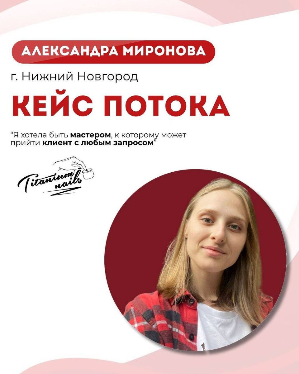 ✨ Когда мастер по-настоящему влюблён в своё дело — это видно сразу. Александра из Нижнего Новгорода — именно такая. Она не просто делает ногти, а ищет решение для каждого клиента. Даже если у клиента аллергия, даже если онихолизис, даже если ногти испорчены после снятия. 🔹 За 1,5 года она перепробовала всё: японский маникюр, IBX-систему, спа-процедуры, плёнки... Александра пришла ко мне на онлайн-курс “Все секреты титановых ногтей 3.0” и сразу рассказывала всем о будущем обучении. Клиенты начали интересоваться. Кто-то уже тогда записался в модели. 🌸 Первые титановые ногти делала себе, потом бабушке. Даже такой серьезный критик оценил покрытие, которое впервые за долгое время относилось 3 недели! Сейчас Александра: — быстрее на 30-60 минут работает даже с гелем — спокойно делает сложный опил — помогает клиентам с тяжёлыми случаями — уверена в себе и больше не боится увидеть “сюрприз” под покрытием клиентов «После курса я как будто стала другой. В голове чётко: что, как, зачем.