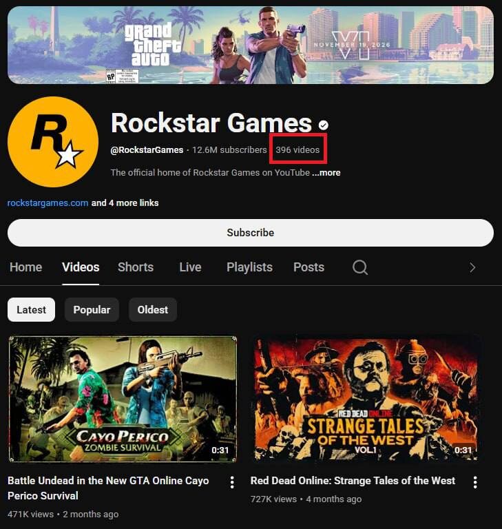 Фанаты заметили, что на канале Rockstar Games два дня назад было 395 видео, а теперь стало 396, хотя ролики не выходили.