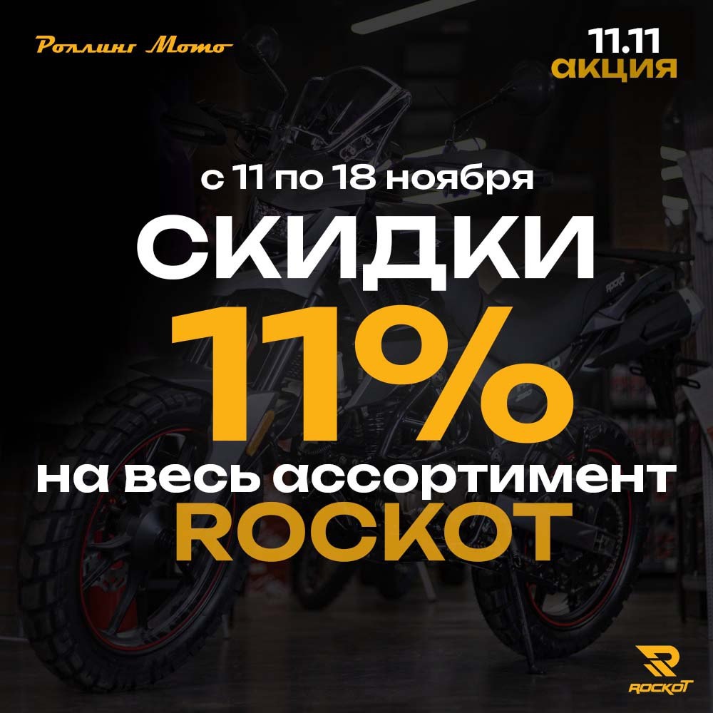 11 по 18 ноября — неделя скорости, свободы и приключений! Лови момент: скидка 11% на все мотоциклы ROCKOT.Выбираешь ли ты горные маршруты, городские улицы или дальние путешествия — ROCKOT готов к любым дорогам. Осень создана для новых стартов. Не упусти свою трассу!