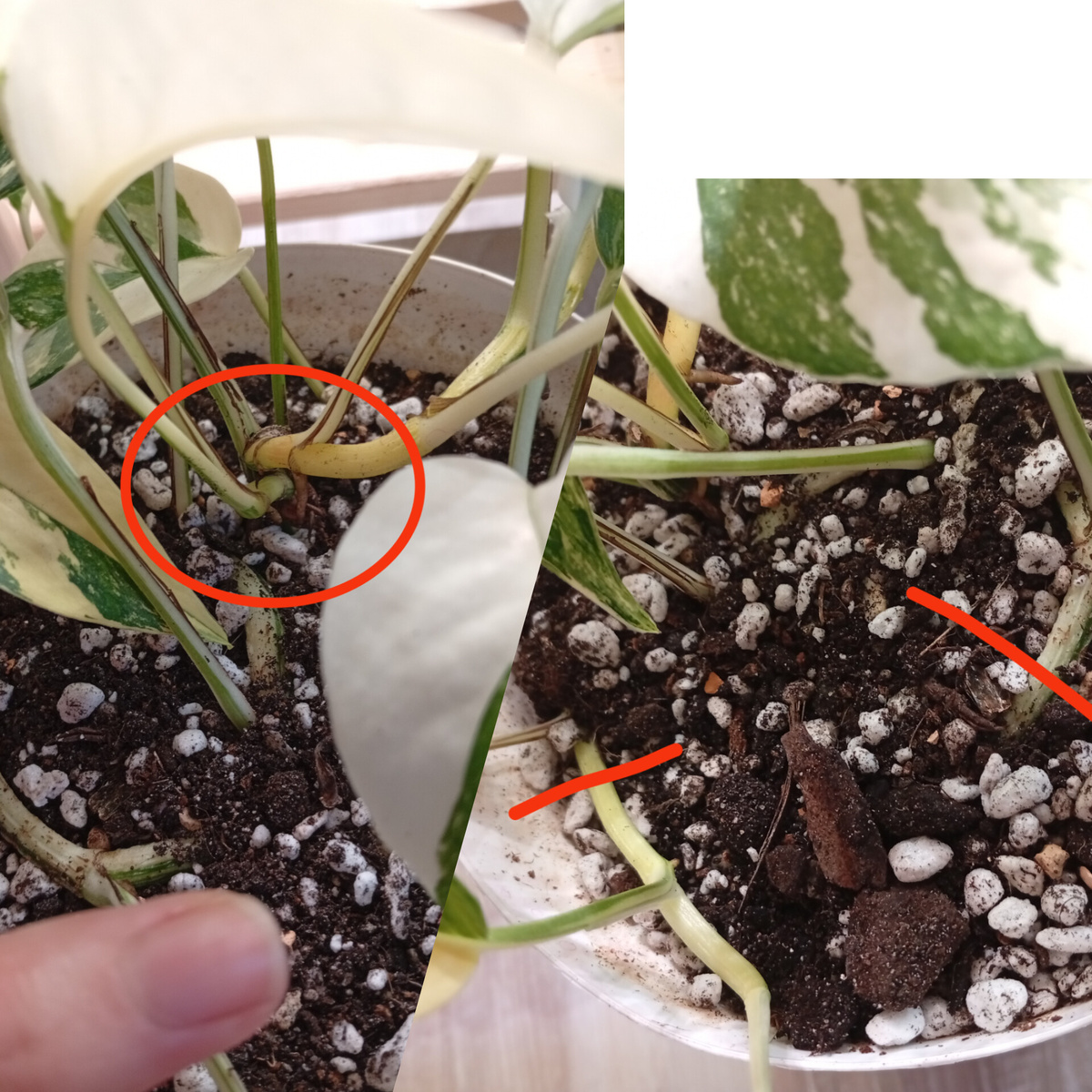 Всем привет 👋 Хочу поделиться с вами своими наблюдениями о том, как можно вырастить (заиметь) красивый, пышный куст эпипремнума. Самый простой и очевидный способ — это приобрести уже сформированный пышный куст в магазине. Однако я предпочитаю наблюдать за процессом роста и развития растения с самого начала. Этот способ заключается в том, чтобы изначально посадить в один горшок несколько черенков, каждый из которых имеет 1–2 листочка. Со временем у каждого черенка активируются собственные точки роста, и через 2–3 месяца вы получите великолепный, раскидистый куст, наполненный жизненной энергией. Все свои эпипремнумы я ращу с одного черенка с парой листьев. Вот что я делаю дальше⬇ Позвольте поделиться конкретными примерами успешного применения этого метода: Эпипремнум Пиннатум Вайт: сделав всего один аккуратный срез на расстоянии трёх листьев от основания, я активировала две новые точки роста. После пересадки планирую выполнить ещё два надреза в предварительно отмеченных