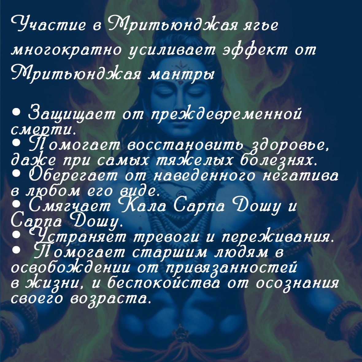 Мритьюнджая мантра - великая мантра Вед. Защищающая от смерти. Перед Калабхайравой, пришедшим на зов этой мантры, оказывается бессилен даже сам Ямарарадж, выдергивающий Душу из тела своей петлей. Есть большая разница в том, как покинуть этот мир. Уйти на привязи к Ямарараджу, и проходить все тяготы посмертия. Или получить бессмертие, как способность не терять свое сознание ни во сне, ни после ухода из мира. И в течении жизни оставаться в единении с Всевышним. Вместить в себя ее значение и возможности очень непросто. Мы с вами будем это делать во время ягьи. Для каждого откроется свое восприятие ее величия! Элена Шанти Деви Мара Подробности участия в ягье Оплата участия (переход на сайт к форме оплаты) Написать в личку (Элена Шанти Деви Мара) Ведические духовные практики