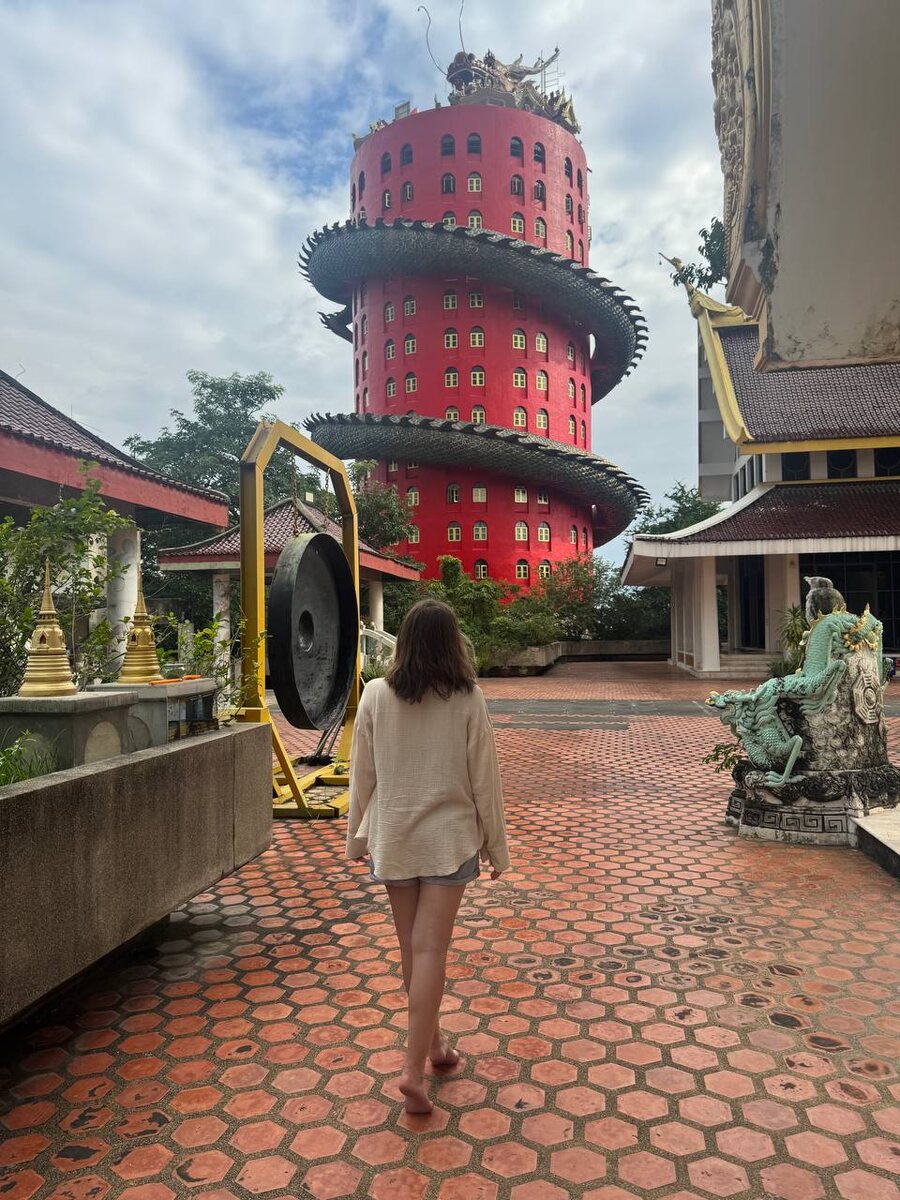 Храм Дракона (Wat Samphran) — это одно из самых необычных и запоминающихся мест недалеко от Бангкока. Он представляет собой 17-этажную ярко-красную башню высотой около 80 метров, вокруг которой обвивается гигантский зелено-красный дракон. Построенный в 1985 году, храм символизирует духовное восхождение и имеет большое значение для буддистов. Внутри дракона расположен винтовой туннель, по которому посетители могут подняться на смотровую площадку и полюбоваться панорамой окрестностей. На данный момент храм отреставрирован - при поиске информации, мы видели только розовые фотографии храма. Он полностью покрашен в красный цвет, что придает ему еще более яркий и привлекательный вид. Благодаря своей интересной и уникальной форме, Wat Samphran однозначно заслуживает посещения туристами. Практическая информация для туристов • Вход на территорию храма бесплатный, подъем на башню стоит около 80 батт с человека. Также везде размещены чаши для пожертвований. • Работает ежедневно, обычно с 6:00 ил