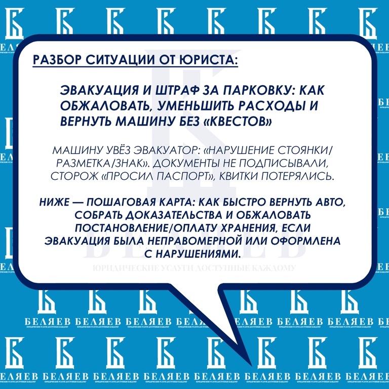 🚓 Эвакуация и штраф за парковку: как обжаловать, уменьшить расходы и вернуть машину без «квестов» 🟦 Сценарий Машину увёз эвакуатор: «нарушение стоянки/разметка/знак». Документы не подписывали, сторож «просил паспорт», квитки потерялись. Ниже — пошаговая карта: как быстро вернуть авто, собрать доказательства и обжаловать постановление/оплату хранения, если эвакуация была неправомерной или оформлена с нарушениями. 1) 🅿 Сначала — возврат авто (без признания вины) Узнайте спецстоянку (телефоны на табличках/через дежурную часть). Возьмите паспорт/СТС/вод. удостоверение/полис, доверенность — если не собственник. На стоянке не спорьте о правоте — цель: забрать машину. Требуйте копии актов, протоколов, квитанций. Оплату фиксируйте чек-картой/квитанцией. 2) 📸 Сбор доказательств «здесь и сейчас» Фото/видео места, где стояла машина: знак/разметка/схема дорожной обстановки, расстояния, видимость (ночь/снег/ветки закрывают знак). Снимите все документы эвакуации: протокол, акт задержани