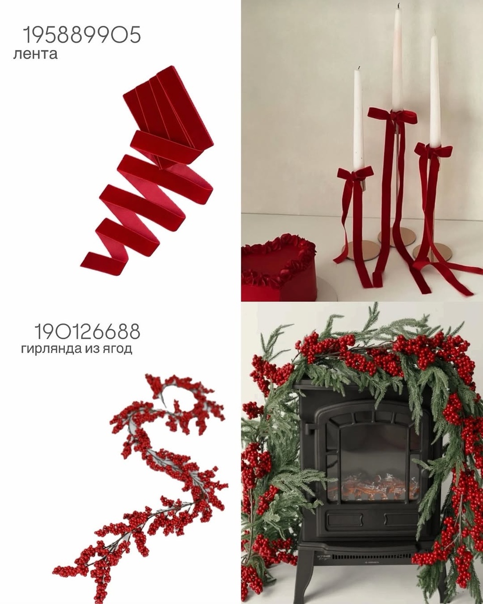 Эта новогодняя подборка с вайлдберриз строится вокруг трёх элементов: насыщенного красного, тёплого металла и мягкого света. Бархатная лента и гирлянда из ягод задают живые акценты, подсвечники и звезда создают тёплое сияние, бокалы становятся украшением стола, а две необычные ёлки отвечают за сказочный характер интерьера.